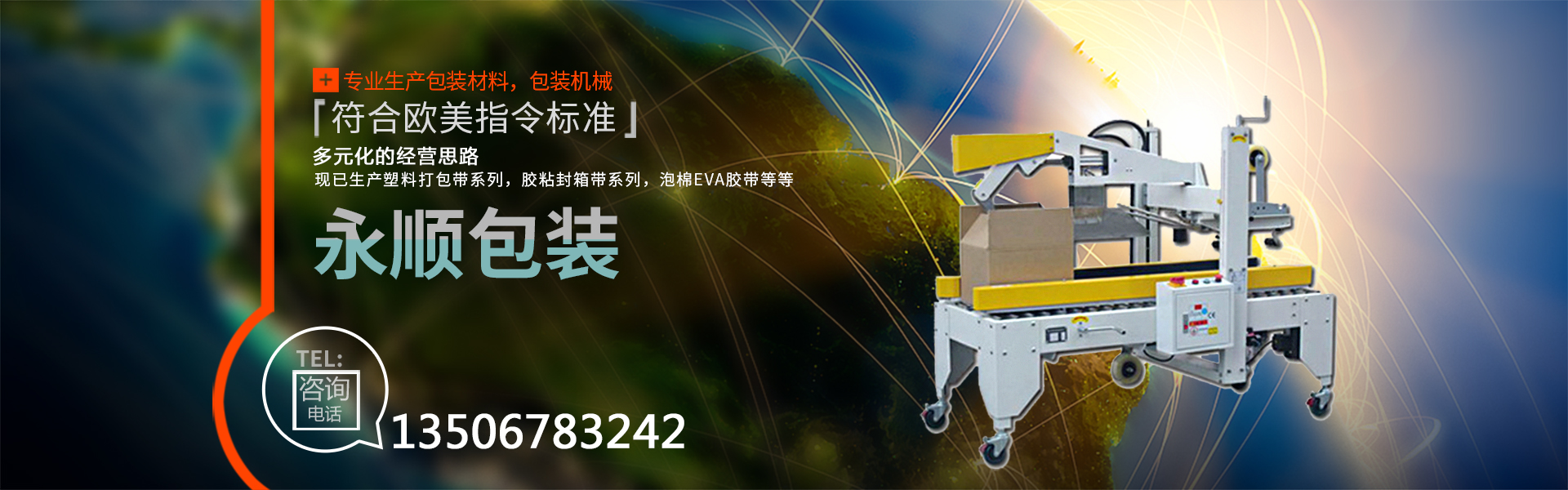 慈溪市永順包裝材料有限公司是一家專業生產包裝材料,包裝機械的廠家。公司自創建以來,經過不斷的努力,憑借優異的產品質量,良好的售后服務,在市場上取得了突飛猛進的業績,獲得了客戶的廣泛認可與贊譽。公司本著多元化的經營思路,現已生產塑料打包帶系列,膠粘封箱帶系列,泡棉EVA膠帶,鋁箔膠帶、美紋膠帶、牛皮膠帶、文具膠帶。全自動打包機,收縮包裝機,移印機,真空包裝機,自動封口機,纏繞膜裹包機,等各種包裝機械(無人化全自動包裝機械)。其中塑料打包帶、粘膠帶已全面通過SGS認證,符合歐美指令標準。